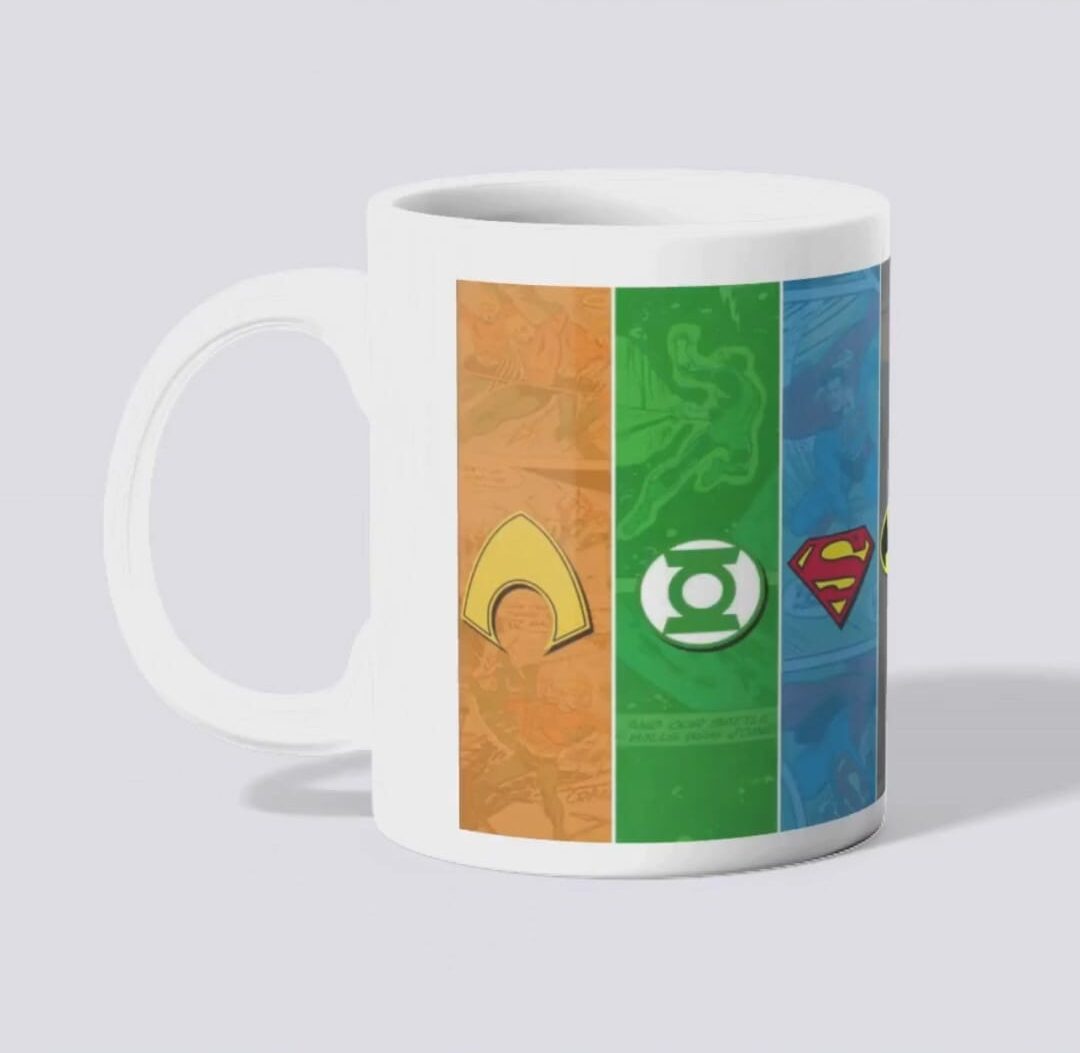 Leve a força dos maiores heróis da Terra para o seu café da manhã! Esta caneca exclusiva da Daarte apresenta um design panorâmico com os emblemas icônicos do Superman, Batman, Mulher-Maravilha, Lanterna Verde e Aquaman. Com um acabamento artístico que remete às cores clássicas das HQs, é o presente ideal para quem sabe que todo herói precisa de uma pausa para o café.